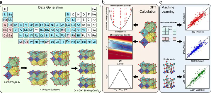 In response to growing demand for cost-effective, highly active, and stable catalysts for the electrocatalytic oxygen evolution reaction (OER), we have developed a comprehensive database for AA’BB’O6-type cubic double perovskites (DP) and implemented a machine learning high-throughput screening (ML-HTS) strategy to discover promising DP for OER. Our approach covers a vast chemical space of approximately 6,500 DP by considering all valid compositional combinations. Additionally, we have developed two machine learning (ML) strategies to predict thermodynamic stability (energy above the hull and Pourbaix decomposition energy) and binding Gibbs free energy, enabling an efficient exploration of the chemical space. Both models, trained with minimal calculations, achieve high accuracies even with unrelaxed structures (mean absolute error (MAE) 0.028 and 0.031 eV/atom for Pourbaix stability and energy above hull, respectively, and MAE 0.124 and 0.129 eV for O* and OH* binding Gibbs free energy, respectively). By utilizing the descriptor-based ML models and graph-based pretrained universal ML potential, we evaluated the stability of approximately 3,500 bulk structures and the activity of around 14,000 surfaces, respectively. This ML-HTS approach led to the successful and efficient identification of 15 novel DPs that are predicted to be more active and stable than established DPs such as LaSrCoFeO6 (LSCF).
