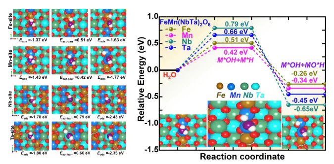 The rising demand for sustainable green hydrogen production necessitates efficient and cost-effective water-splitting electrocatalysts. Inspired by the catalytic activities of columbite-tantalite, this study combines a scalable cutting-edge synthesis approach with atomic-level structures and metal-center-mediated mechanisms to unravel its operational performance and stability. Using ad in situ X-ray absorption fine structure combined with Density Functional Theory (DFT), the results reveal distinctive valence band peaks and moderate charge transfer from Mn and Fe sites, enabling stable adsorption and reduced activation barriers. In contrast, the high-valence Nb and Ta centers at the B-sites promote favorable d-band alignment, enhancing orbital overlap with oxygen p-orbitals. This facilites electronic delocalization, lowers charge accumulation, and reduces activation barriers of intermediates species. Fe and Mn at the A-sites exhibit strong redox reactivity and optimal adsorption for OH* and O*, supporting efficient electron fransfers. Solvation effects modeled via VASPsol further stabilize key intermediates, especially O*, reducing the energy barrier for water dissociation. Notably, FeMn(NbTa)2O6-columbite catalysts stand out with a cell voltage of 1.81 V at a current density of 700 mA cm−2, compared to 40% Pt/C-RuO₂ (1.75 V) at the same current density in the anion exchange membrane water electrolyzer (AEMWE). Also, the FeMn(NbTa)2O6-columbite exhibits long-term stability at 800 mA cm−2, surpassing the benchmark 40% Pt Vulcan-RuO2 after 200 h in AEMWE. This work significantly advances current research and establishes a design rule for selecting metal compositions in the development of advanced electrocatalysts in alkaline water electrolyzers.