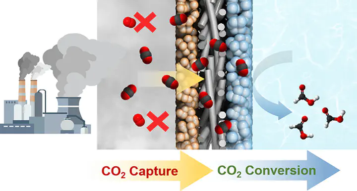 Integrated capture and conversion of low-concentration CO2 is a critical step toward carbon neutrality. Here, we demonstrate a gas diffusion electrode (GDE) modified with oxygen- and nitrogen-functionalized porous graphitic carbon (ONC) that enables efficient electroreduction of dilute CO2. Under 15% CO2 gas (without O2), the ONC-modified GDE achieved a CO2-to-formic acid conversion rate of 250 μmol/h·cm2, 2.5 times higher than that of the bare GDE, with a Faradaic efficiency (FE) of 98%. Even in flue gas containing 8% O2, the modified GDE achieved 22 μmol/h·cm2 formic acid production (8% FE) at −1.4 VRHE. Mechanistic and simulation studies revealed that the oxygen functional groups in ONC enhance CO2 adsorption while suppressing O2 permeation, imparting strong oxygen tolerance. In particular, the ONC-modified GDE remains active at a CO2 concentration as low as 1% and 400 ppm, suggesting potential applicability in integrated capture–conversion systems that utilize dilute CO2 streams from flue gas and ambient air.